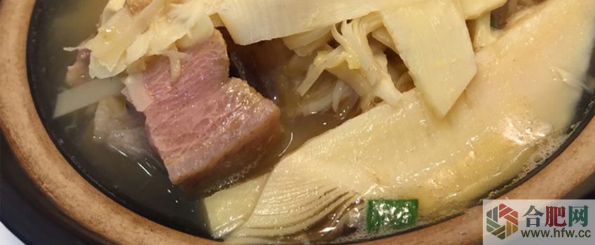 徽州冬筍煨火腿是一種湯品,其以火腿、冬筍、冰糖、豬油等為原料。燒制出來的成品湯色乳白,筍色淡黃,火腿片點綴其間,艷麗悅目,鮮美異常。