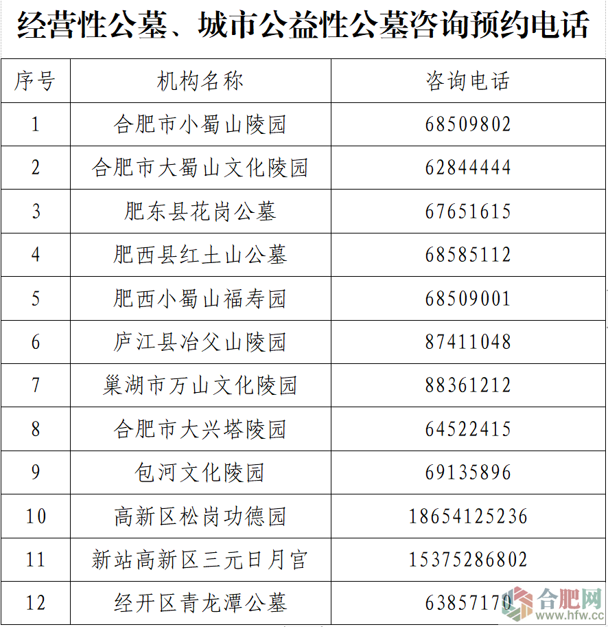 合肥市民政局也提倡廣大市民進行網上祭掃或自行聯系各殯葬服務機構代為祭掃。如有市民確需到現場祭掃請提前通過各陵園、公墓電話及微信公眾號咨詢預約,無預約不得現場祭掃。部分陵園預約方式