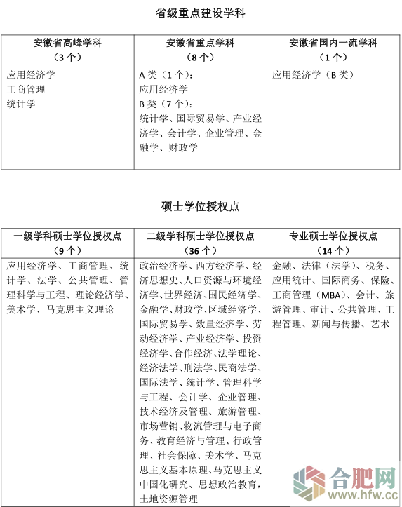 學校堅持育人為本。建校以來,累計為國家和社會培養各類人才18萬余人。學校目前在全國31個。ㄊ、自治區)一本批次招生,現有全日制本科生、研究生20317人,繼續教育學生1萬余人,F有50個在招本科專業,其中國家級一流本科專業建設點24個、省級一流本科專業建設點18個,一流專業占比位居安徽省高校第2,F有5門課程入選首批國家一流課程、1門課程入選首批國家級課程思政示范課程。學校學生在學科競賽中的成績,位列2017至2021年全國普通高校大學生競賽榜單人文社科類高校第3。學校不斷推進知識探究、能力提升、素質培養、人格養成“四位一體”人才培養體系建設,不斷深化“新文科”“新工科”人才培養改革,探索實踐“新經管”人才培養模式,致力于培養具有社會責任感、人文情懷、科學精神和國際視野的高素質創新型人才,畢業生受到社會廣泛認可。