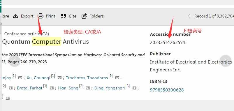 3、需要注意的是,查詢完后需要點標(biāo)題查看文章詳情,Accession number就是我們需要查找的EI檢索號,例如:Accession number: 202**514262574